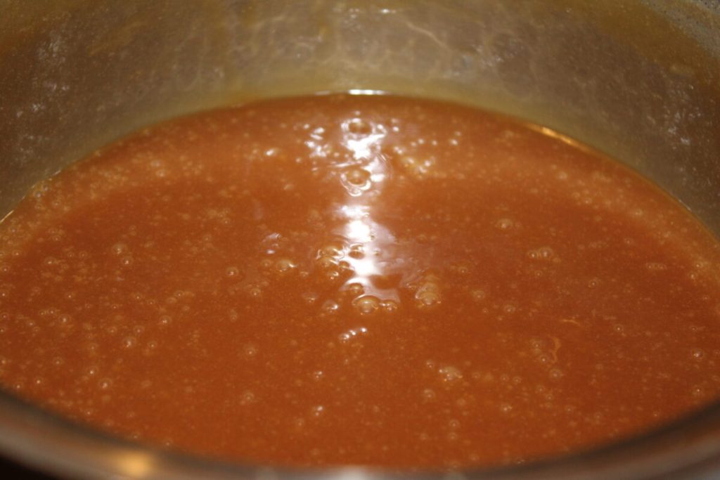 • Enquanto isso, prepare o caramelo, na verdade, você pode até prepará-lo antes e batê-lo quando for usar. Deixe o açúcar escurecer em fogo médio, na panela de fundo duplo para não queimar; abaixe ainda mais o fogo e com muito cuidado adicione o creme de leite quente, mas não fervente.