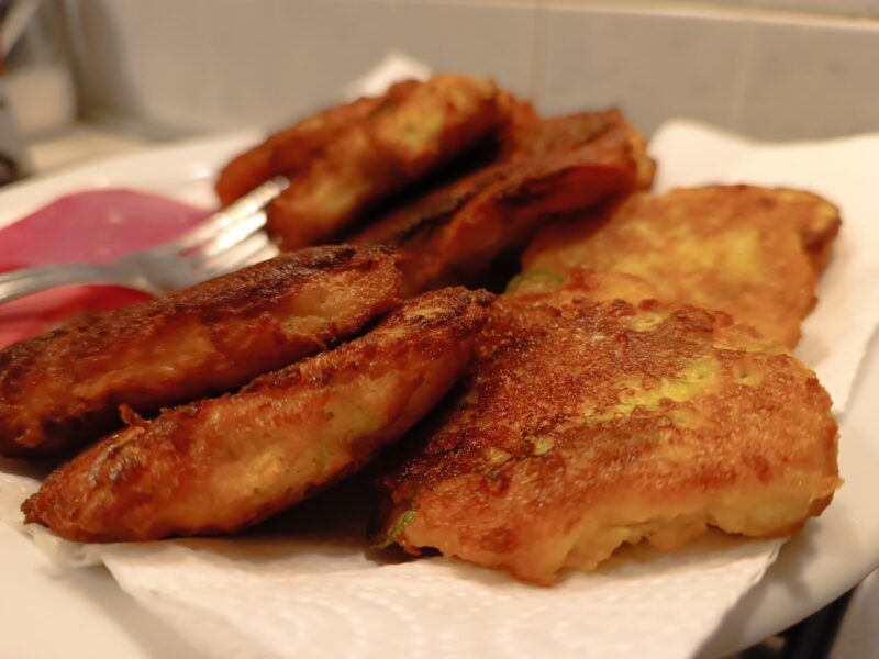 Antigamente, no campo, muitos vegetais colhidos acabavam em frituras; tudo era utilizado, e cada “sobra” do dia anterior acabava em alguma receita para reciclar; nesta é previsto também o pão amolecido no leite, ou pão ralado. Quando sobra pão, deixo secar e ralo, para ter sempre à disposição.