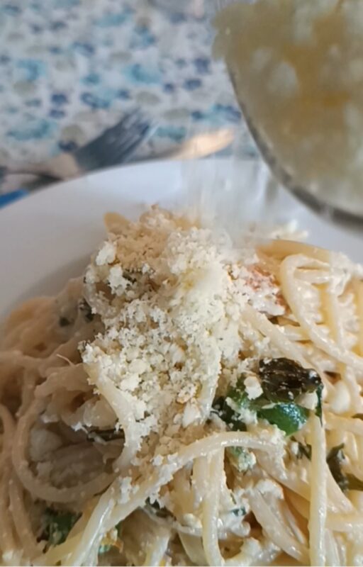 Neste caso, também usei ricota de ovelha, junto com os ovos das minhas galinhas… Spaghetti super deliciosos