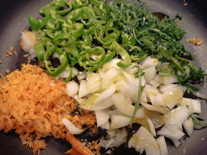 Há os pimentões, cebolas, cenouras… Vegetais a km “0” mesmo morando em uma cidade pequena, meu jardim fica entre as casas no quintal, então sou sortuda; colho e cozinho!