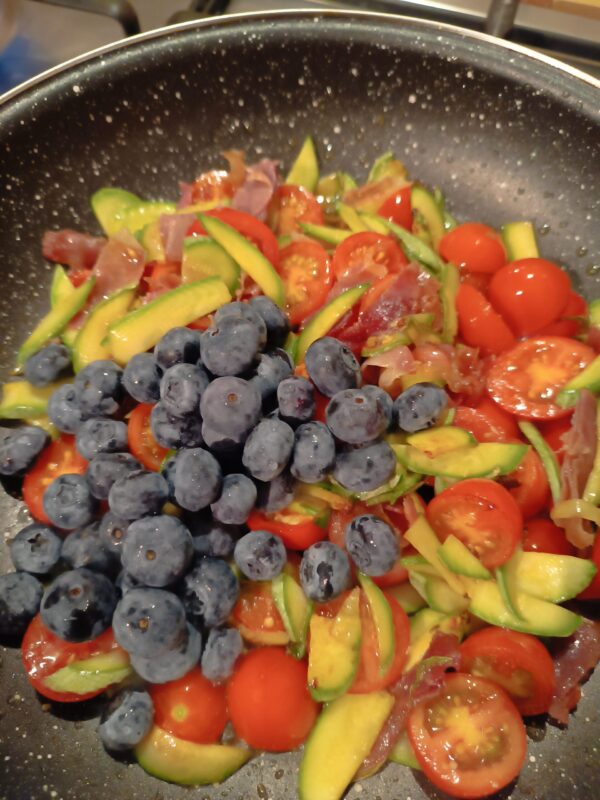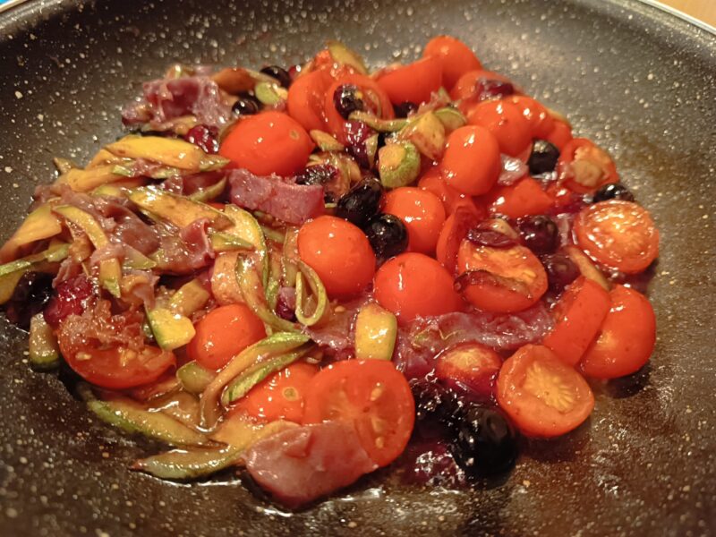 Eu deveria unir os suprimentos disponíveis…Tagliatelle, tomates, abobrinhas e presunto cru…