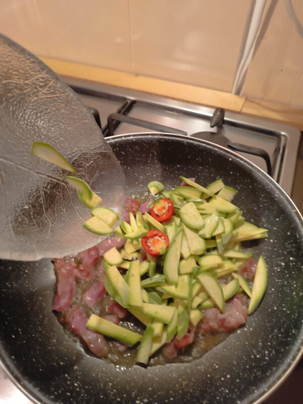 Toque o presunto em um pouco de azeite e, adicione as abobrinhas; cozinhe por poucos minutos para deixá-las um pouco crocantes