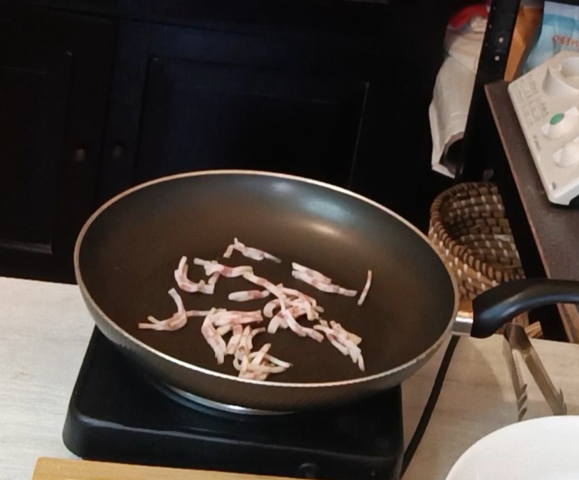 Aqueça uma frigideira e coloque o guanciale para dourar, eu não coloquei óleo, (na foto a porção é para dois) com a própria gordura unta-se a frigideira…