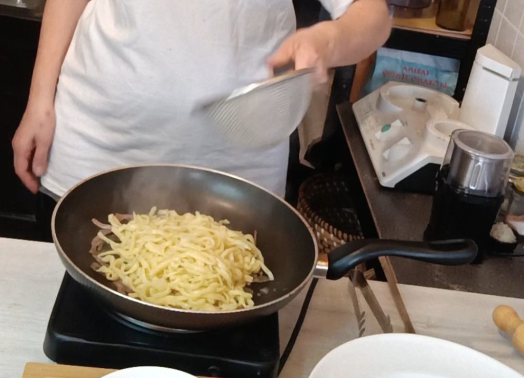 Passado o tempo, estenda-o na bancada com o rolo de massa até obter uma espessura de cerca de 3 mm; enfarinhe bem e enrole para cortar os tonnarelli; a largura ideal seria cerca de 2 mm; estes têm seção quadrada, caso contrário, com uma pequena porção de massa faça rolinhos cada vez mais finos como se fossem espaguetes… Neste caso você terá os tonnarelli de seção redonda.