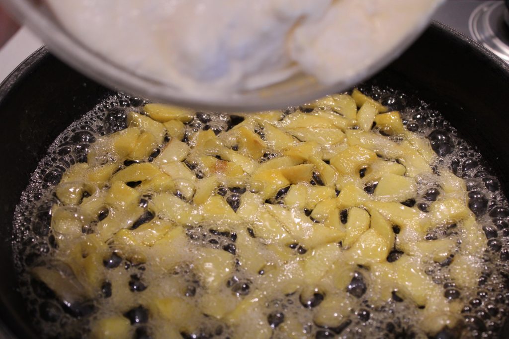 Primeiramente, descasque os pêssegos, essa operação não é necessária se estiver usando nectarinas. Adicione-os a 100 g de açúcar e deixe caramelizar na frigideira. Finalmente, adicione a noz de manteiga. Mantenha o fogo baixo.