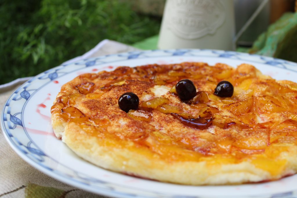 Vire sua torta de pêssego no prato de servir, se desejar, adicione um pouco de caramelo.