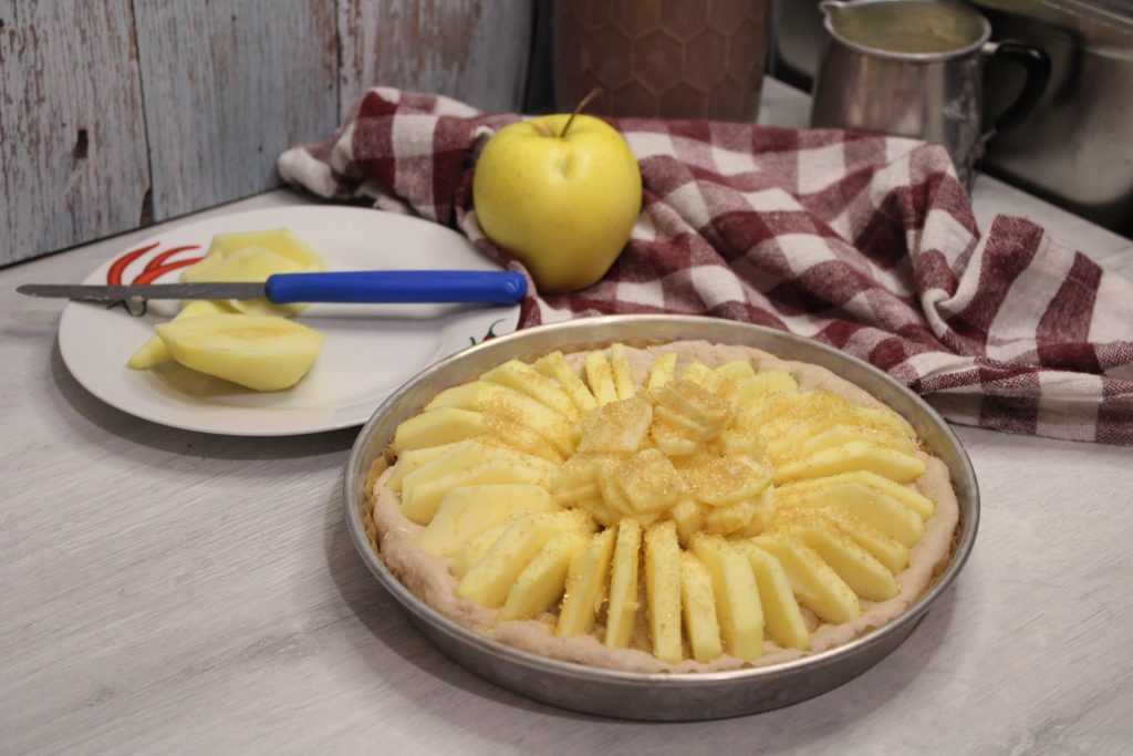 Arrume as maçãs fatiadas e deixe levedar por cerca de duas horas, ajuste-se com a temperatura ambiente que tem em casa; pode levar menos tempo se estiver acima de 20 graus.