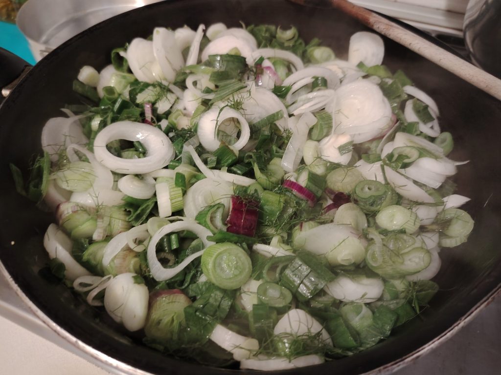 Enquanto isso, corte as cebolinhas, incluindo a parte verde, depois de limpá-las de qualquer resíduo não comestível. Doure em uma frigideira com o vinho e o sal, em seguida, adicione as ervas picadas e deixe secar.