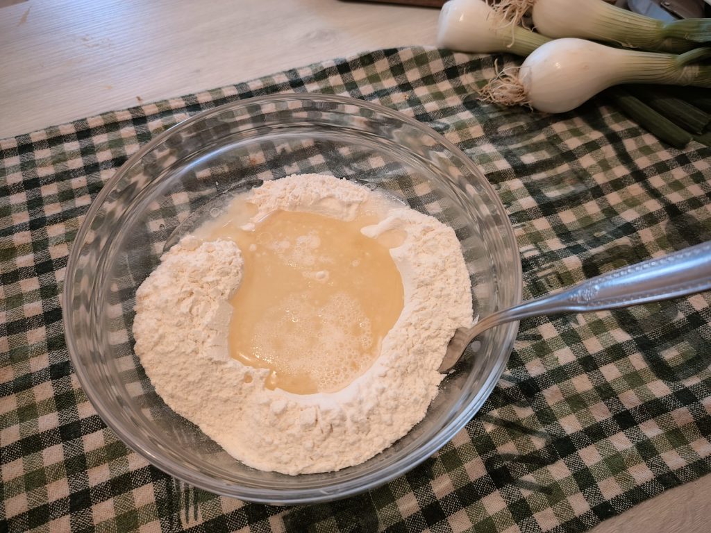 Primeiro prepare a massa brisée; em uma tigela misture a farinha peneirada com o fermento e o sal, adicione o óleo e a água e amasse bem.