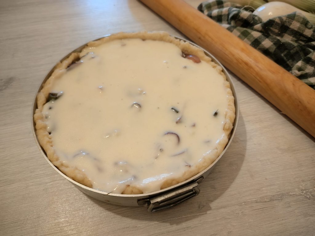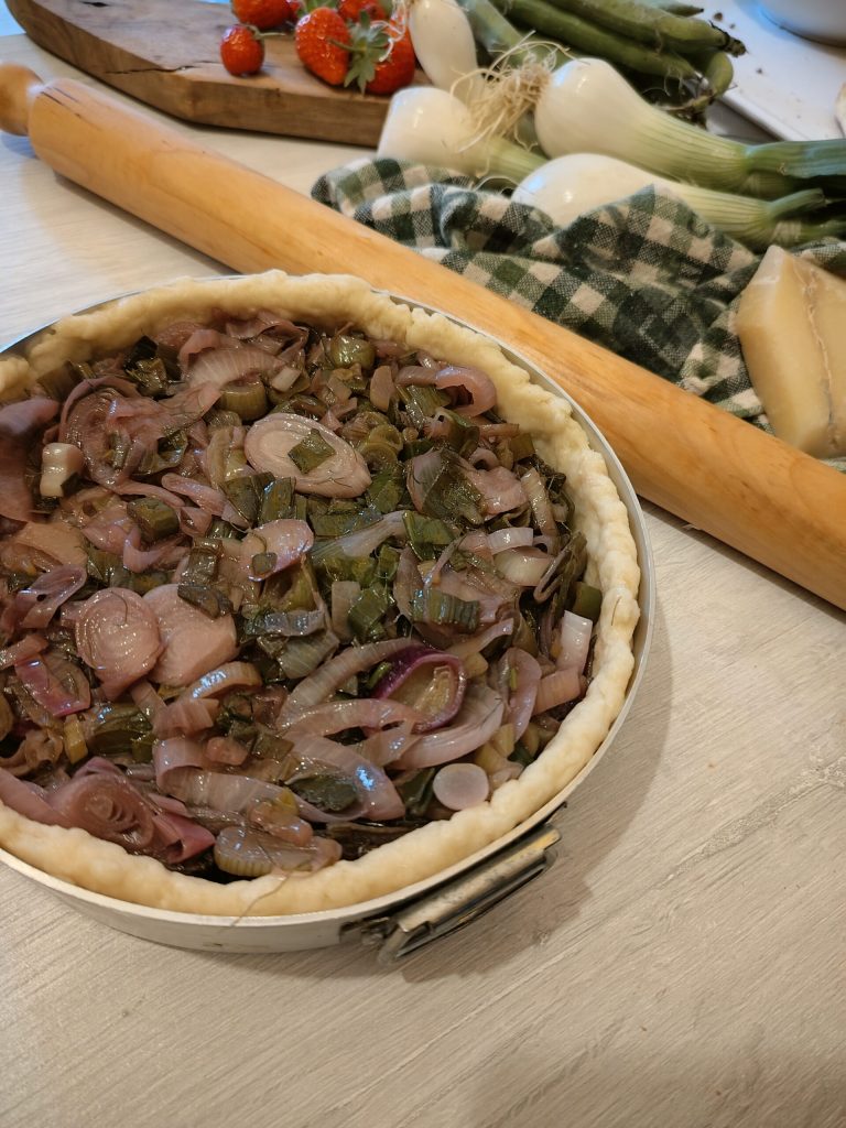 Forre a forma com a massa brisée, estendida com o rolo, e despeje as cebolas. Nivele bem…