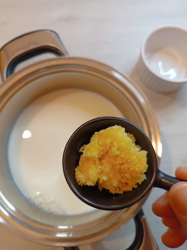 • Depois do limão, adicione a sêmola, não espero que o leite ferva, adiciono antes, evitando assim a formação de grumos.
