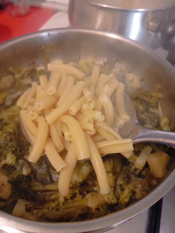 Cozinhe as batatas cortadas em pedaços e os brócolis em buquês em água salgada, que depois você usará também para a massa; quando estiverem cozidas, transfira uma parte para a frigideira que você usou para refogar o alho e a anchova; adicione um pouco de água de cozimento e misture bem.