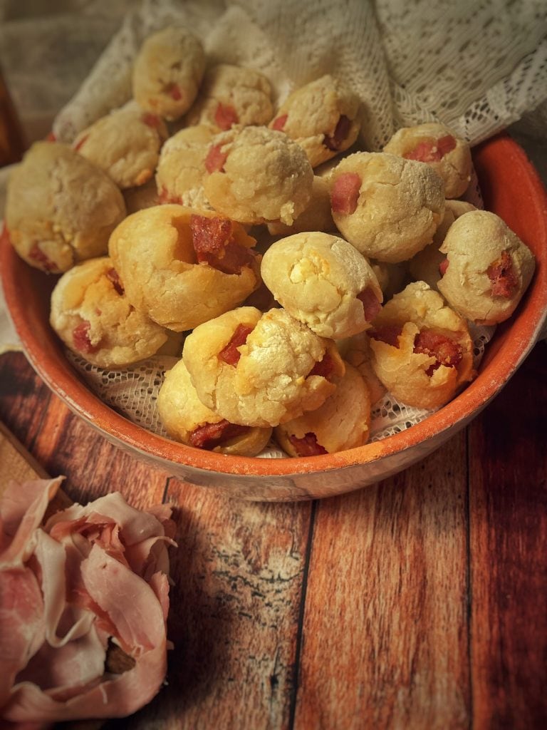 Pequenos bocados, do tamanho de uma noz, de massa brioche – que eu preparei com farinha de arroz – recheados com cubos de frios e queijos, um clássico da rotisserie napolitana e um finger food muito na moda.