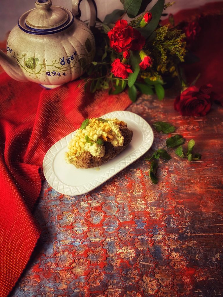 O recheio é um mousse de tofu com hortelã e amendoins torrados.