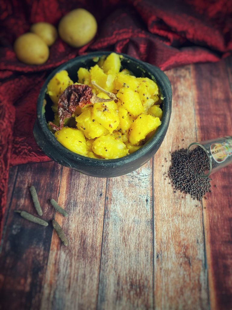 Em uma panela, refogue no óleo de mostarda; as sementes de mostarda, o cominho, a assafétida. Adicione as batatas, a cúrcuma, a pimenta e cerca de 1 copo e meio de água.