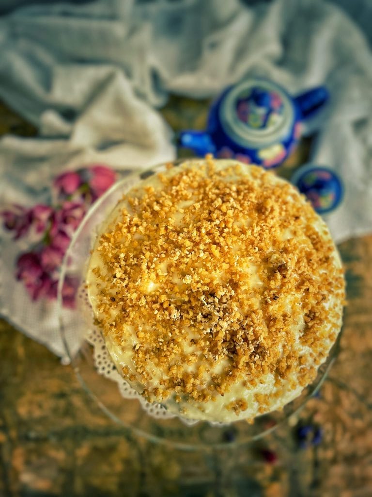 O bolo do sul geralmente tem duas ou três camadas com nozes pecã (ou nozes), e uma cobertura de queijo cremoso doce que também é o recheio das camadas.