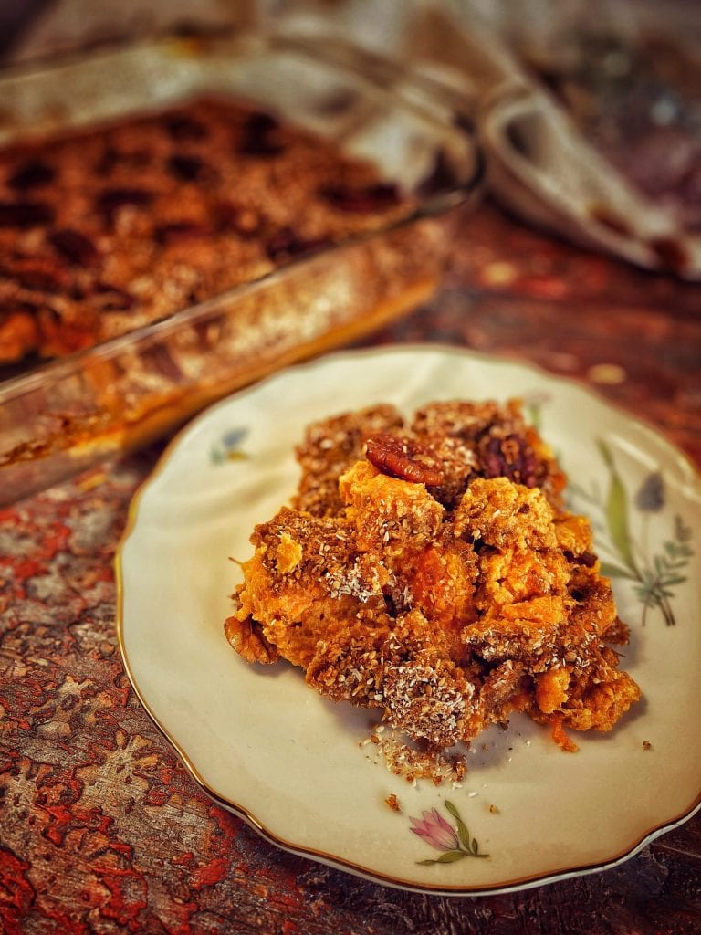 Existem versões salgadas e doces da preparação, como esta: Casserole de batata doce com batatas doces, nozes-pecã e creme de leite típica do Dia de Ação de Graças.
