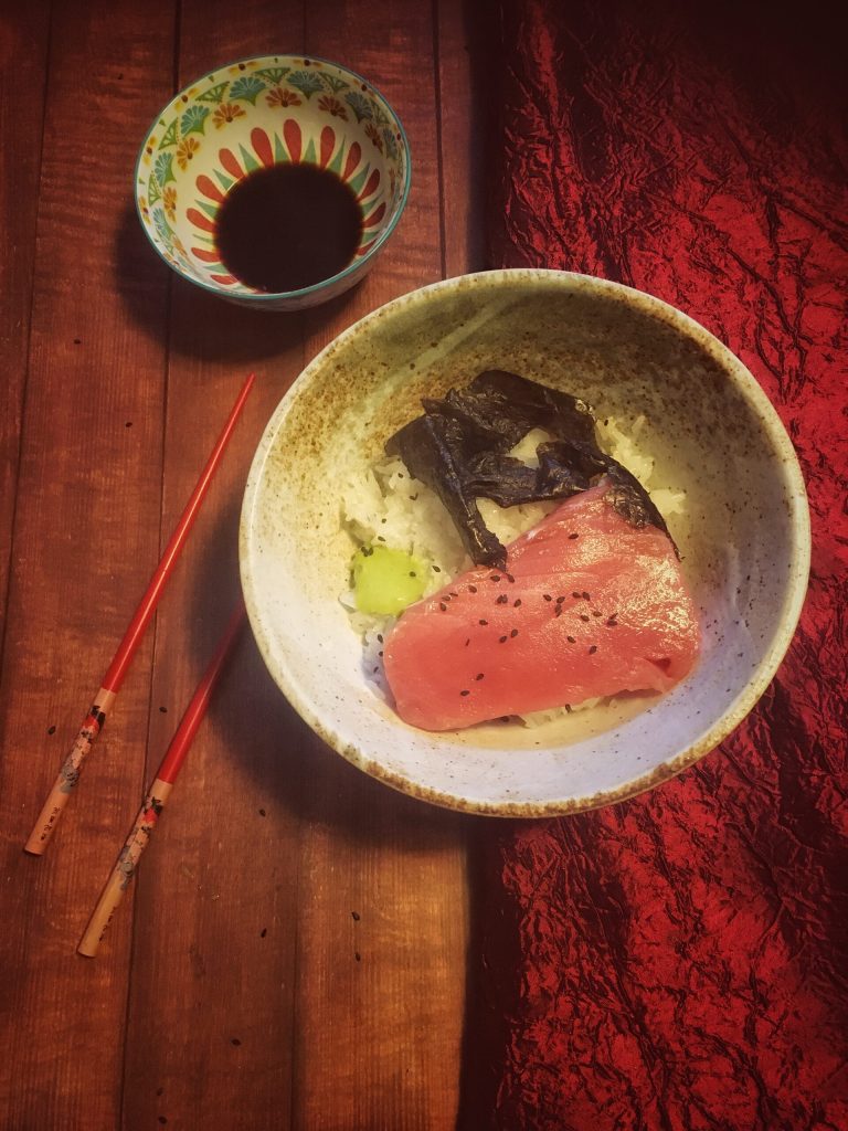 – Tekkadonburi onde no arroz apenas se colocam fatias de atum e também deveria ter um montinho de wasabi em forma de Monte Fuji, mas eu limitei a uma colherzinha.