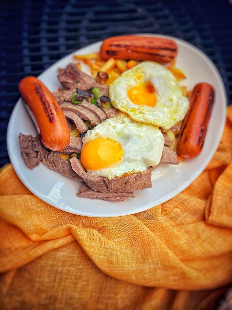 Monte: disponha as batatas fritas crocantes, a carne e/ou chorizo e cebola uma sobre a outra, finalize com os ovos fritos por cima de tudo.
