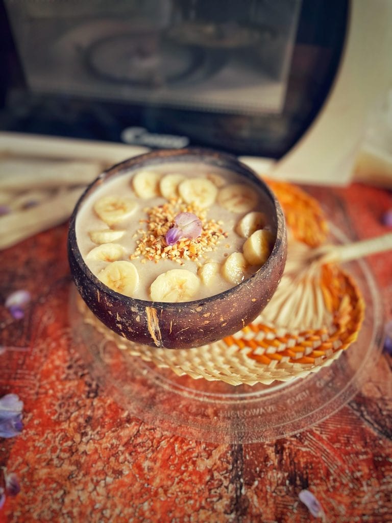 Sirva bem gelada guarnecida com fatias finas de bananas e granulado de avelãs.