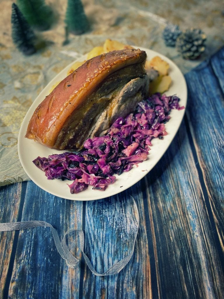 O assado é geralmente servido com batatas caramelizadas e/ou repolho roxo com vinagre: Flæskesteg og brunede kartofler (com batatas) e flæskesteg med rødkål (com repolho roxo).