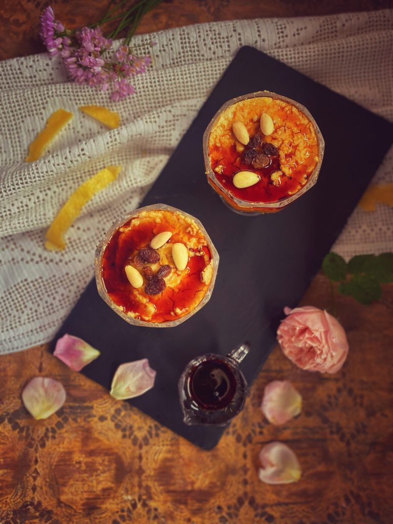 Servir frio, em tigelas com uva passa e amêndoas e o xarope de palma.