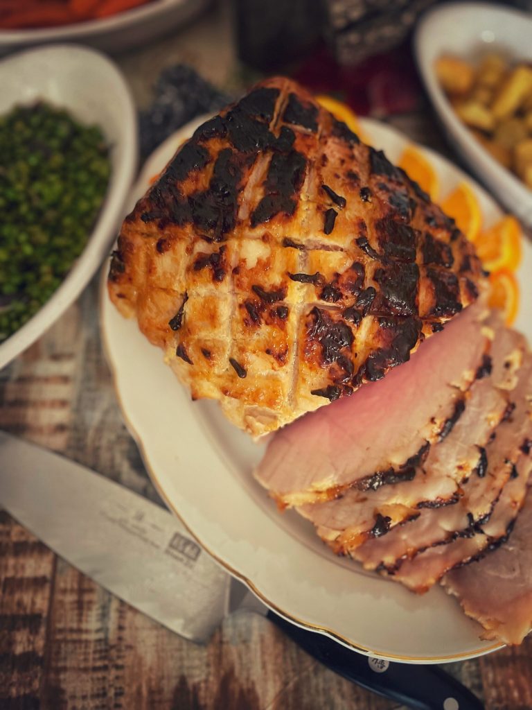 Na tradição do Sunday Roast inglês, o gammon é servido com acompanhamentos como batatas assadas, ervilhas, repolho, cenouras e pastinacas, gravy ou molho de mostarda. Eu optei por laranjas, batatas assadas, ervilhas e cenouras glaceadas.