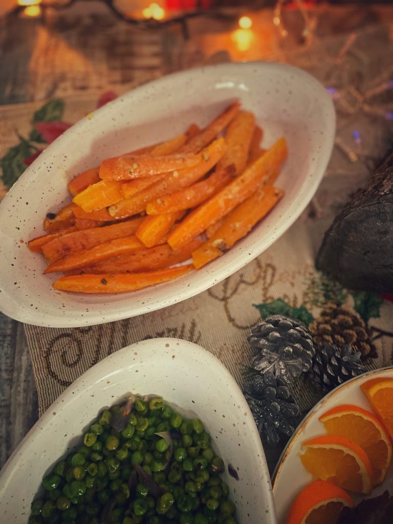 Na tradição do Sunday Roast inglês, o gammon é servido com acompanhamentos como batatas assadas, ervilhas, repolho, cenouras e pastinacas, gravy ou molho de mostarda. Eu optei por laranjas, batatas assadas, ervilhas e cenouras glaceadas.