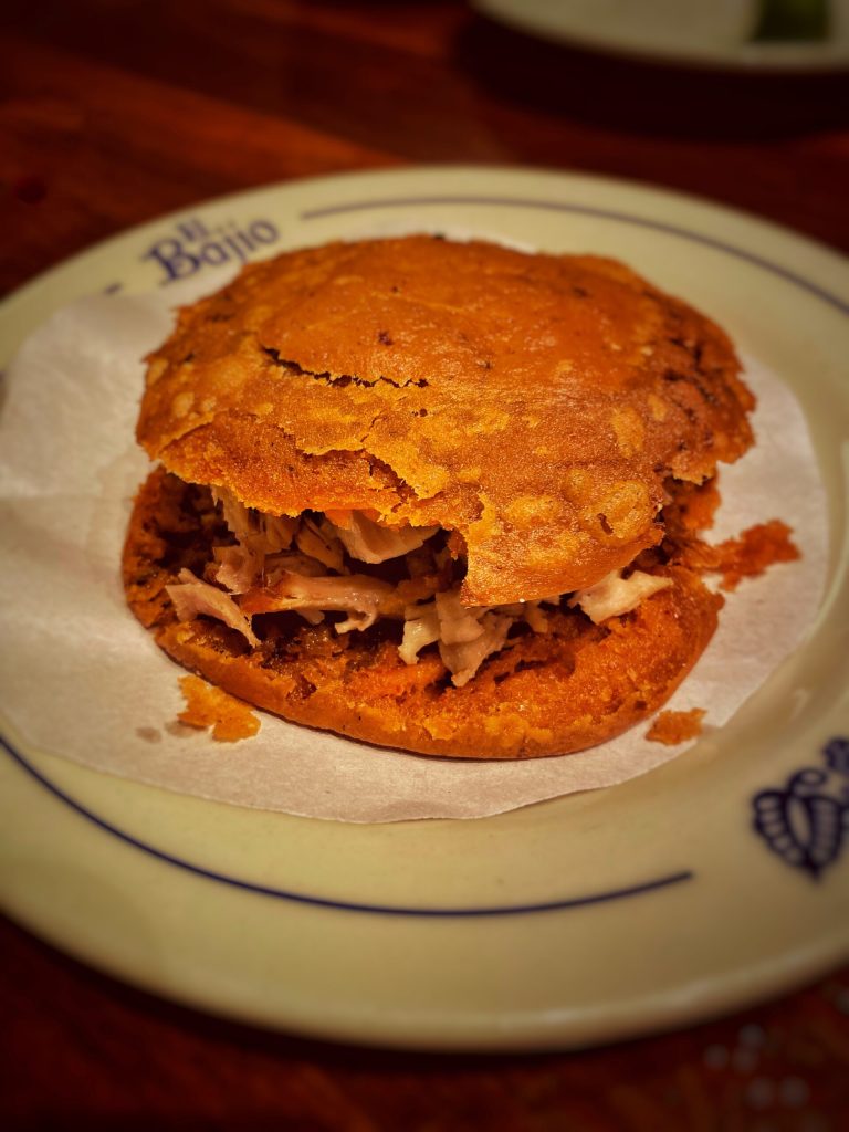A variante mais comum é a “gordita de chicharrón”, recheada de chicharrón (pele de porco frita), como as pupusas salvadorenhas.