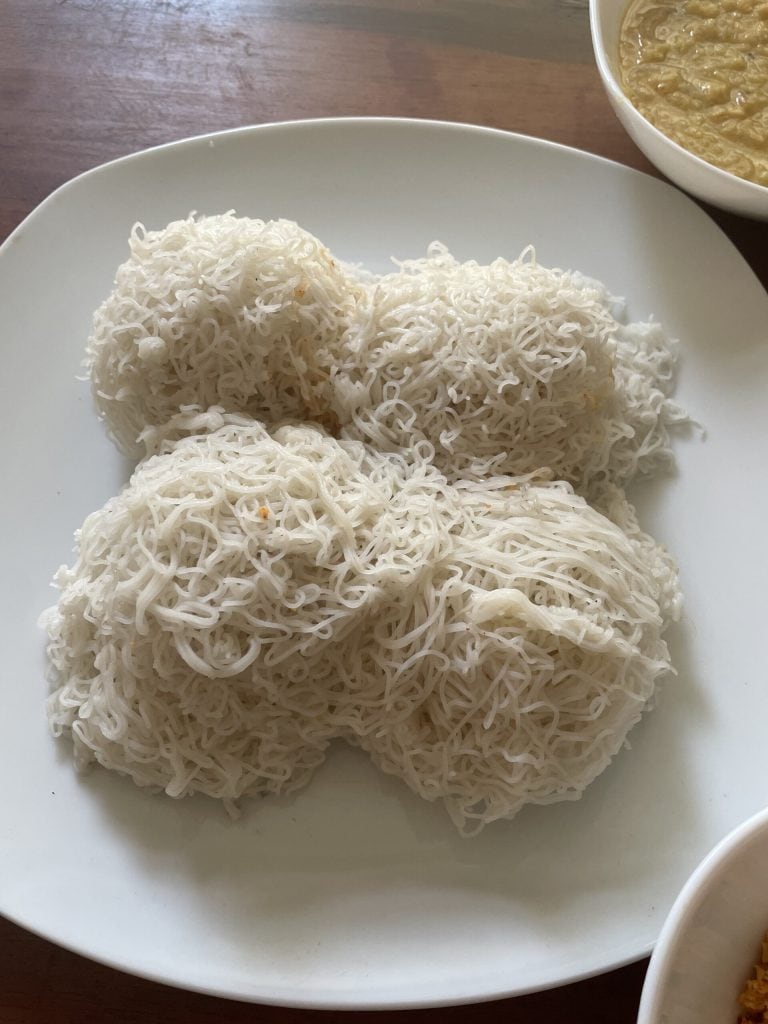 No Kerala / Tamil Nadu, o idiyappam é servido com ensopados, chutney, leite de coco doce, curries vegetais ou não.