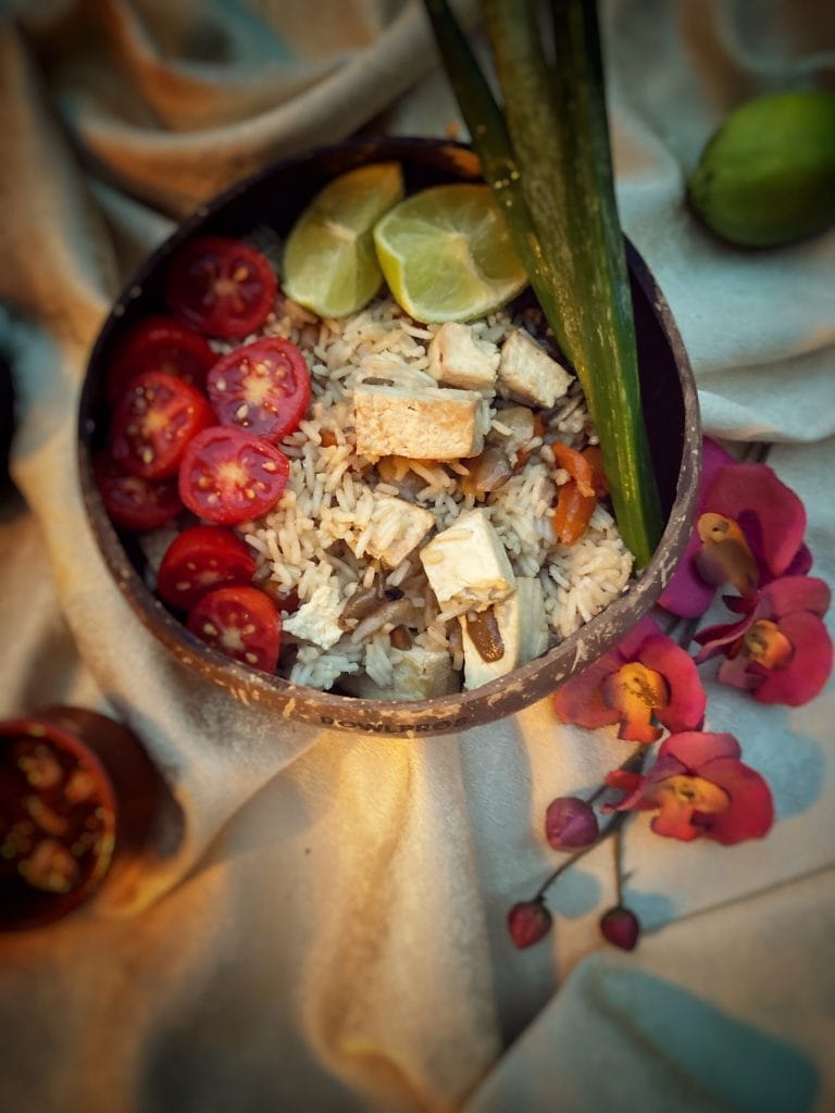 A minha é a versão vegetariana do Kaho Pad, ou seja, Kaho Pad Che ข้าวผัดเจ, para a rubrica #construindoomenu, no menu vegetariano é com: