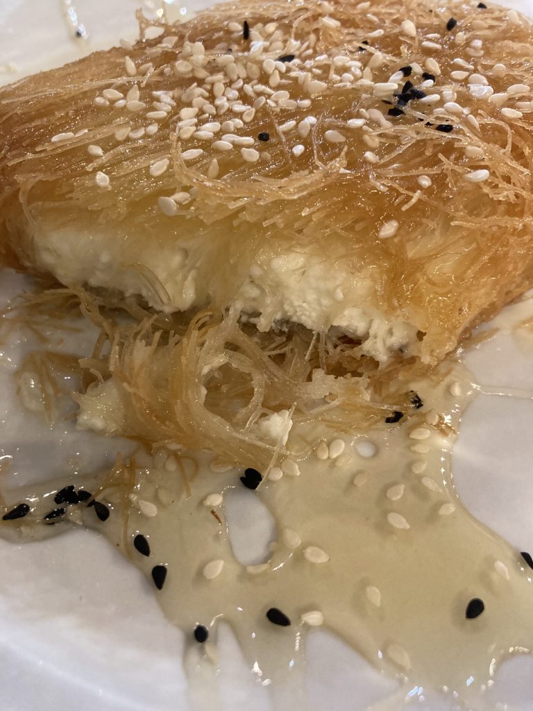 Esta é a versão Khishnah, caracterizada pela massa kataifi deixada íntegra para máxima crocância, em contraste com a versão ‘Na’amah’ que é mais lisa.