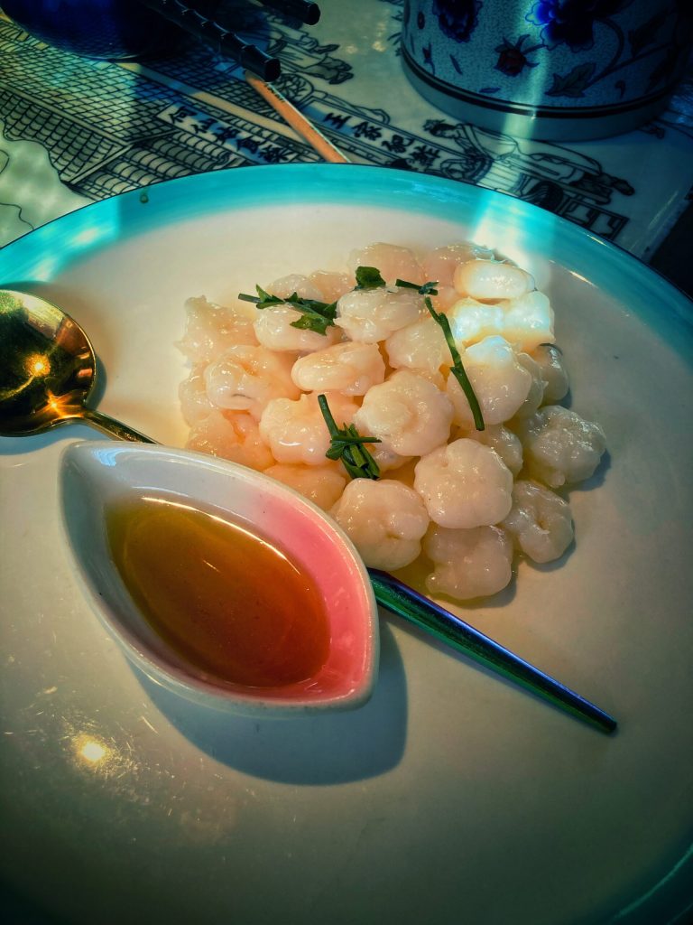Camarões ao chá verde Longjing 龙井虾仁 ou Lóng jīng xiā rén, também conhecidos como Camarões ao chá do poço do dragão, uma receita típica de Hangzhou, província de Zhejiang, onde, de fato, os provamos durante a nossa viagem em janeiro de 2024.