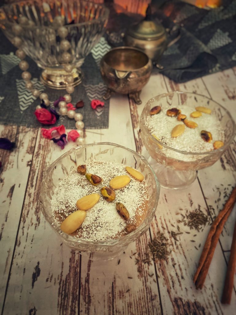 O Meghli é um pudim libanês com especiarias à base de farinha de arroz, perfumado com anis, carvi, canela, e guarnecido com coco ralado e frutas secas. Naturalmente sem glúten e sem lactose.