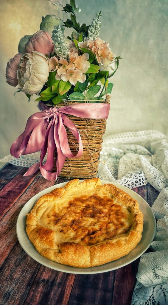 Uma crosta de massa doce contendo um recheio de creme à base de leite, farinha, açúcar e ovos.