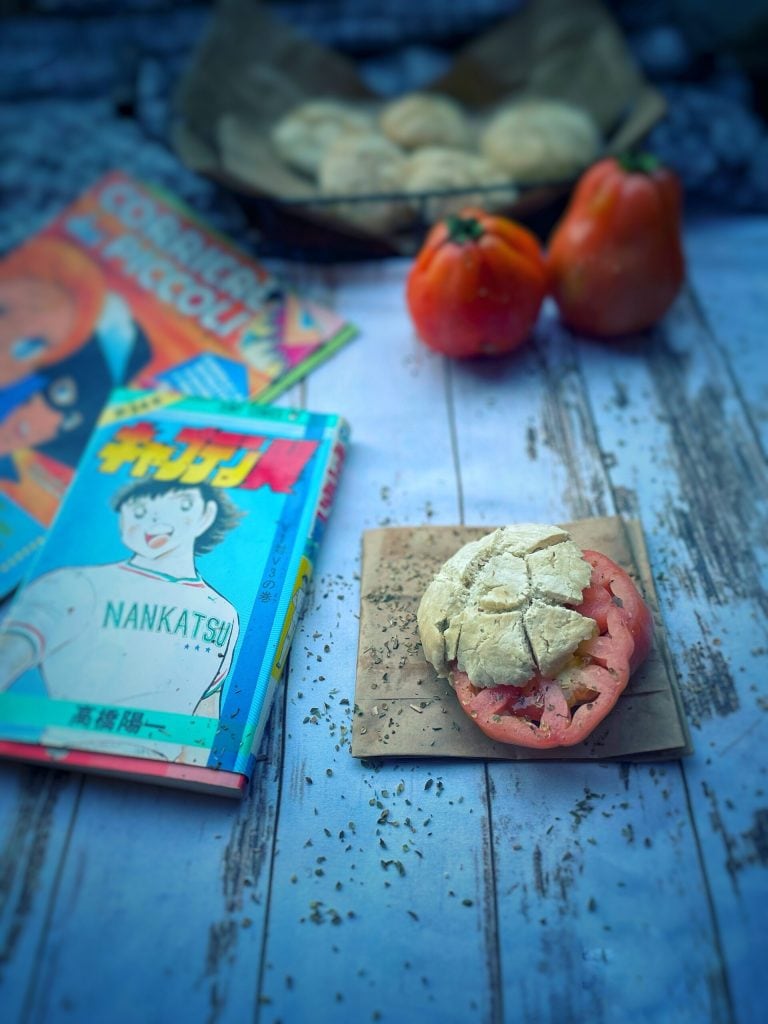 💙 Tenho uma memória vívida de mim quando criança, deitada no tapete da casa da minha avó, com uma grande rosetta recheada com tomate🍅, azeite, sal e orégano, assistindo ⚽”Holly & Benji, dois craques” chamando minha avó para me ler o título do episódio…