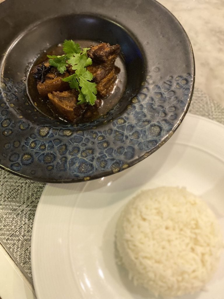Provado no restaurante Rakhang Thai Bistro & Bar , na noite da minha chegada a Ao Nang em 4 de outubro de 2024: barriga de porco cozida com especiarias chinesas, prato típico do sul da Tailândia e especialmente de Phuket.