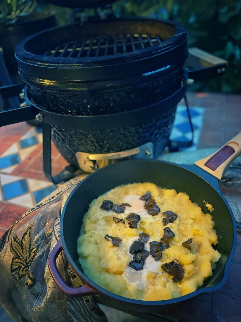Ovo em creme de batatas defumadas no kamado enriquecido com pétalas de trufa é uma receita fácil e reconfortante.