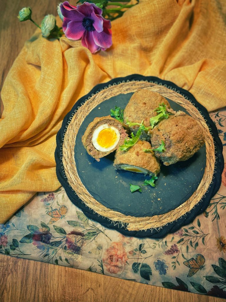 Croccantes por fora, macios por dentro: os Ovos à Escocesa são um prato icônico da tradição britânica, frequentemente servido em pubs, piqueniques ou durante os almoços de domingo.