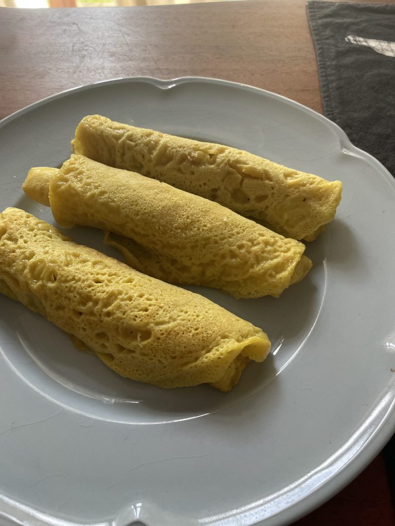 Cozimento: Primeiro se cozinha a crepe em uma panela, depois se recheia e enrola.