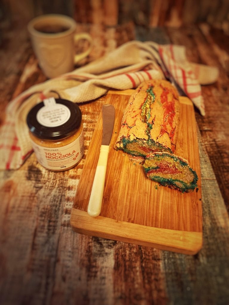 A minha variante Pão de Espiral Arco-Íris Dourado é devida à presença de corantes alimentares, incluindo dourado, azul, amarelo e vermelho, para uma versão sem glúten com farinha de trigo sarraceno.