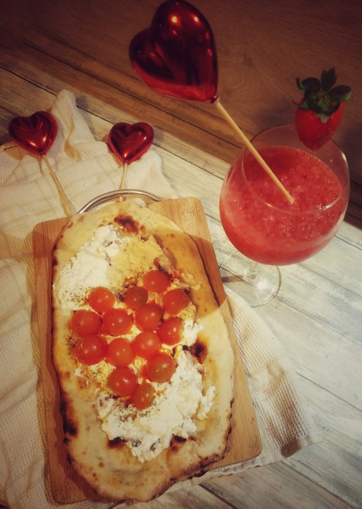 Trata-se da Pinsa de Dia dos Namorados, uma versão em forma de coração da pinsa romana, acompanhada pelo vermelho Daiquiri Frozen de Morango.