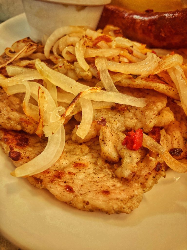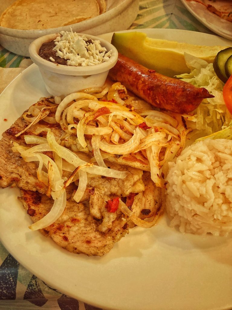 Nós experimentamos o poc chuc em Isla Mujeres, acompanhado também de chorizo.