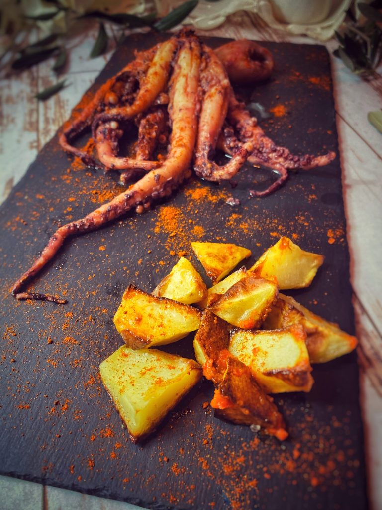 Acompanhei o polvo com batatas bravas, típicas tapas espanholas: batatas cortadas em cubos grandes, fritas em azeite de oliva e temperadas com molho brava, ou seja, um molho picante à base de páprica picante La Vera ou pimenta-caiena, ou uma mistura de páprica doce e picante, cebola e farinha de trigo, ou vinagre, ou caldo.