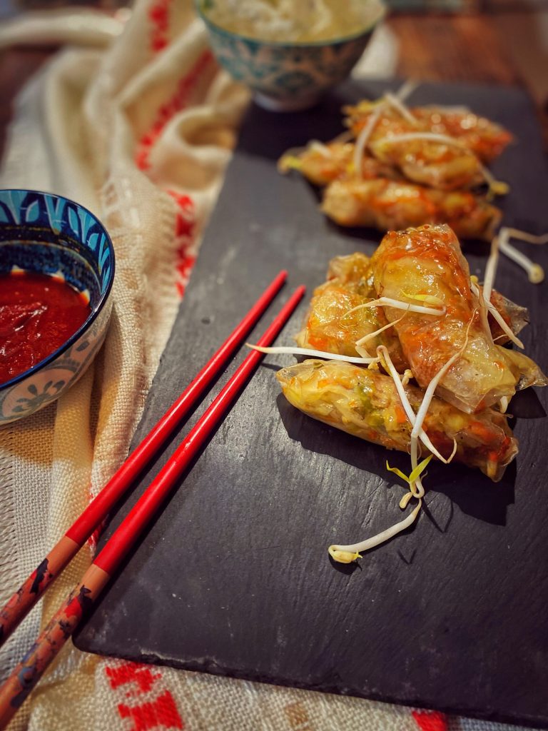 Eu os fiz “clássicos”, como são conhecidos no Ocidente, ou seja, com verduras, tanto assados (veja a foto abaixo) quanto fritos, e os acompanhei com o clássico molho agridoce chinês agridoce feito com: tomate, sal e vinagre de arroz e molho de soja, e chips de folhas de arroz fritos em óleo quente.