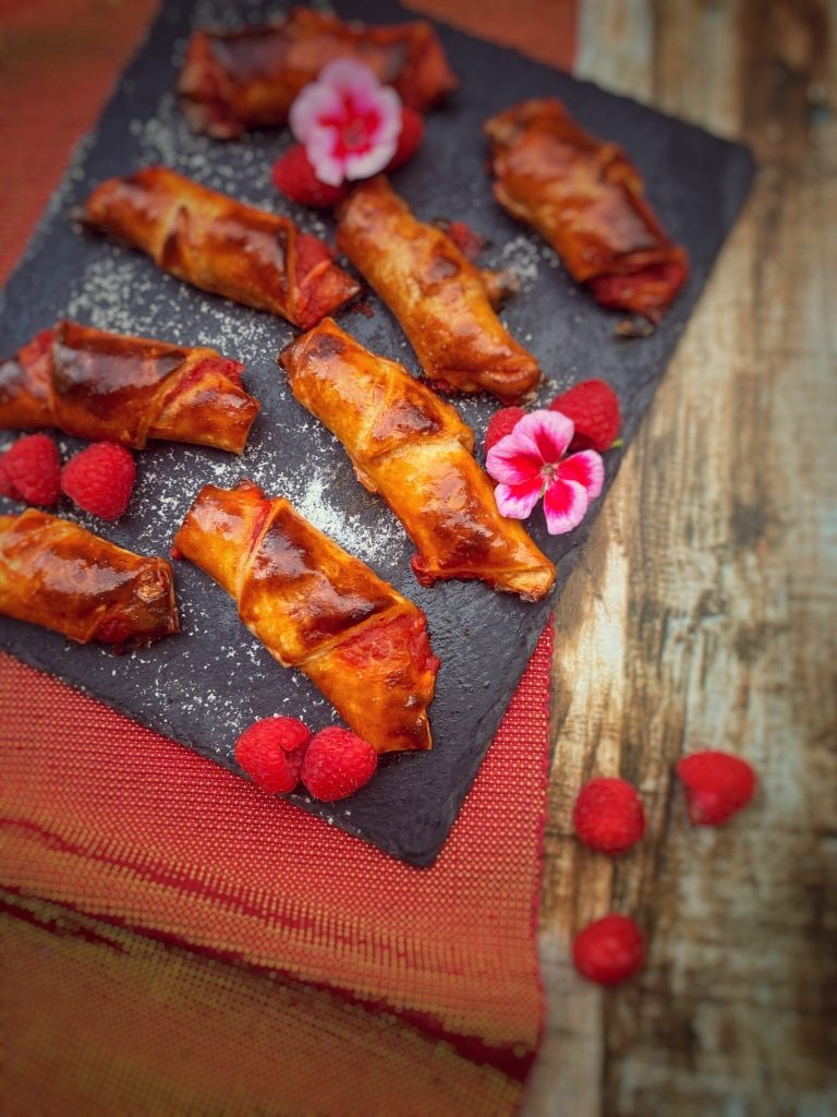 Rechear com a geleia de framboesa e enrolar como um croissant.