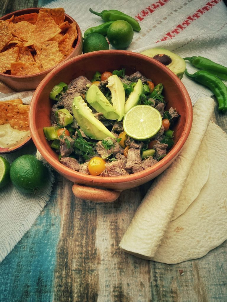 (Eu fiz uma versão meio termo entre a mexicana e a espanhola, cortando a carne em cubos, mas é mais correto desfiá-la finamente).