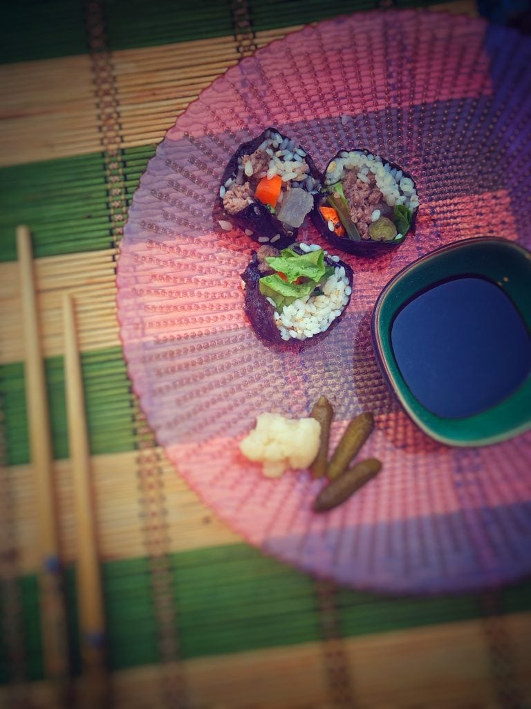 Os Soe-go-gi kimbap são um tipo de kimbap 김밥 : arroz gohan, alga nori, bulgogi, folhas de perila e vegetais em conserva.