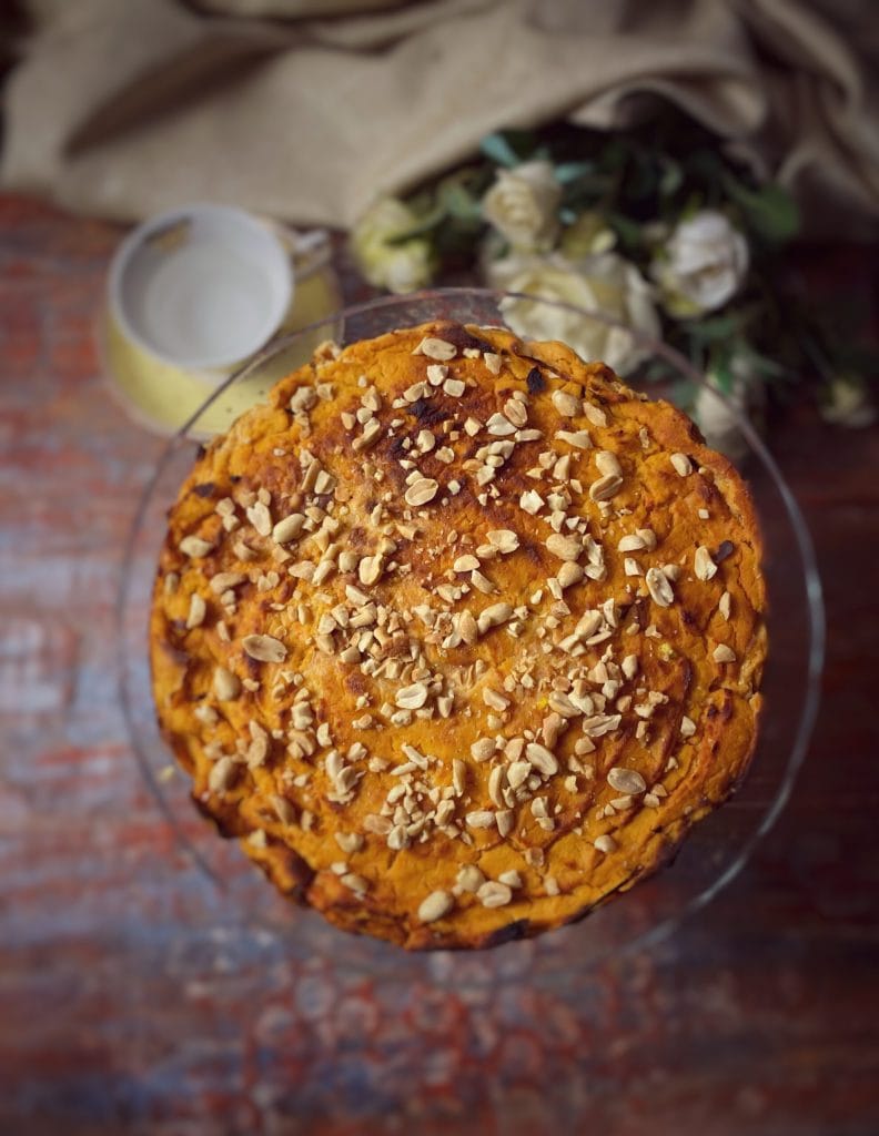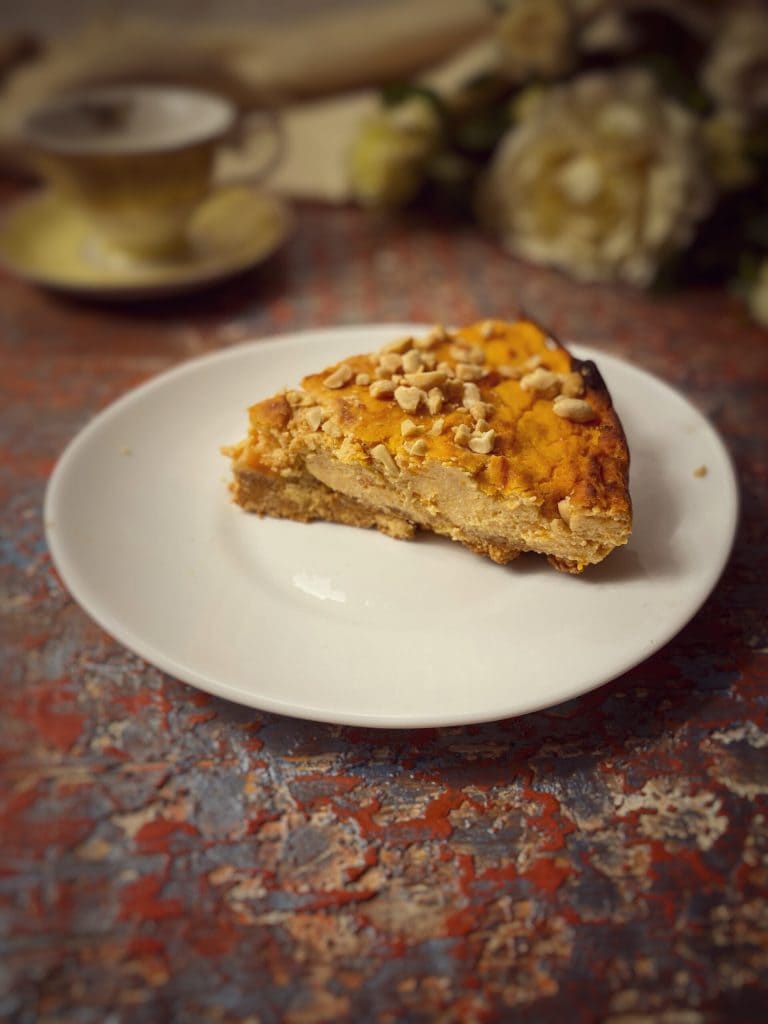 Criei uma base com biscoitos sem glúten nem manteiga, misturados com manteiga de amendoim e triturei o tofu com um purê de batatas-doces, adicionando leite de coco (a parte gordurosa, semelhante ao creme de leite) e decorando com amendoins.