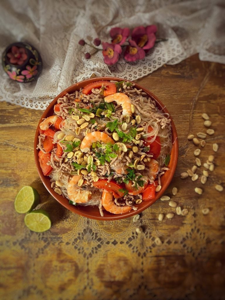 Yum Woon Sen, ou salada tailandesa de noodles de vidro, com os translúcidos noodles de feijão mungo temperados com carne moída e camarões, e um tempero picante à base de suco de limão e molho de peixe.